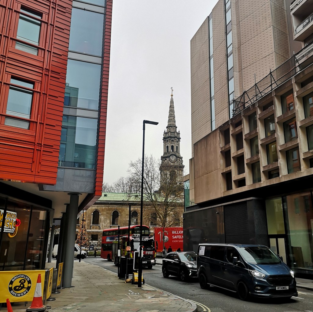Approaching from Tottenham Court Road, I walked through a series of relatively new, glass-and-metal constructions, passing grain bowl eateries, boutiques, and several chain cafés, to suddenly find the small stone church in front of me. It, too, had a small kiosk selling pastries and hot drinks out front, like many historic churches now do, in an effort to make ends meet.