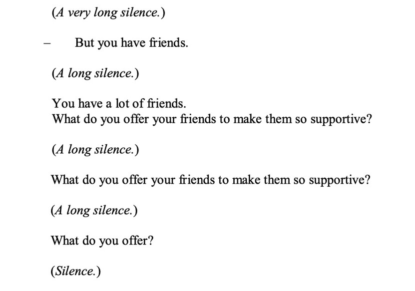 This is the first of the seven patient-doctor dialogues in this play. In this dialogue, the psychiatrist continuously throws questions at the protagonist. This psychotherapeutic technique, known as Socratic questioning, is commonly applied in Cognitive Behavioural Therapy (CBT).6 The underlying premise of CBT is that “‘faulty’ thinking gives rise to anxiety and depression, rather than the other way around”, and the core philosophy of CBT is that “happiness depends not on what happens to us, but on how we interpret it”.7 Therefore, CBT’s approach involves using Socratic-guided discovery questions to identify and challenge various types of faulty thinking. However, this means that compliance with CBT could prevent patients from expressing certain thoughts and expressions that reflect their felt experience. In other words, the primary aim of CBT’s Socratic questioning is not an invitation to speak the language of feeling; it is a preparatory instrument for surfacing and disqualifying “faulty” cognitions, thereby licensing rectification at the level of the patient’s language, thought, and behaviour. In the scene that follows, the psychiatrist’s rapid-fire interrogatives operate exactly as this preparatory apparatus.