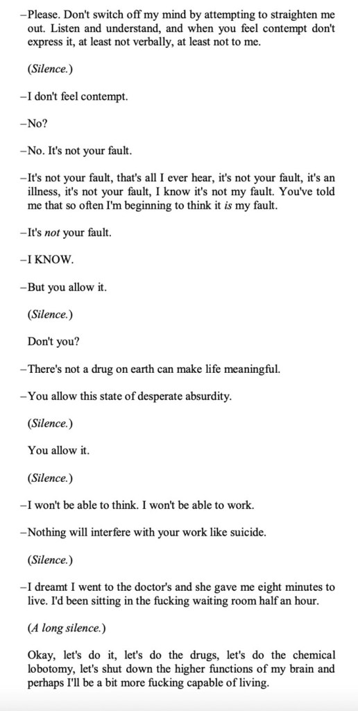 In this dialogue, the psychiatrist accuses her of having “allowed this state of desperate absurdity”. Apparently, the psychiatrist is suggesting that the protagonist remains in this dysfunctional state because she refuses to take antidepressants. By this interpretation, it is not the protagonist’s fault that she has ‘caught’ a mental illness; however, it would be her fault if she insists on receiving understanding from him while refusing his medical prescription. At the end of this dialogue, the protagonist surrenders to clinical power and begins taking antidepressants – an act that causes significant psychological and physical harm and, ultimately, leads to her suicide.